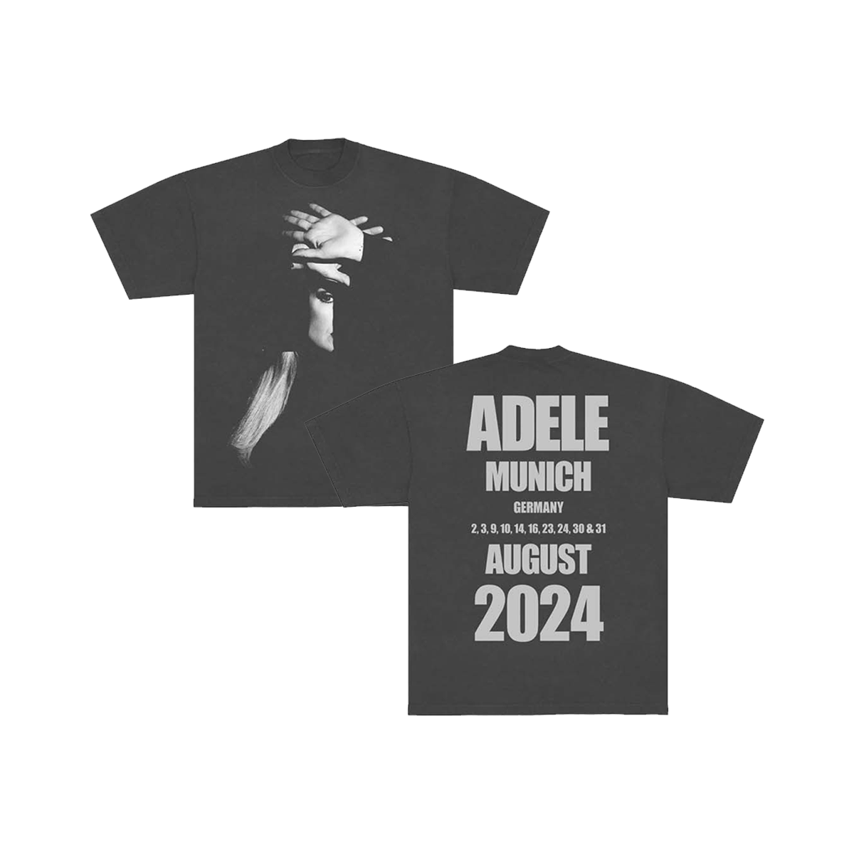 Charcoal short sleeve tee with Adele artwork on the front and Munich event dates on the back. 100% cotton, unisex fit.